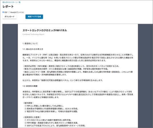 組み合わせによって定義された新技術の概要を1枚のレポート形式で出力することも可能