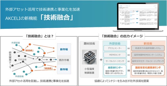 企業のイノベーション支援を手掛けるナインシグマ・ホールディングス株式会社(本社:東京都千代田区、代表取締役社長:諏訪 暁彦、以下「ナインシグマ」)は、2025年4月より提供してきた技術・商材の事業化支援AIサービス「AKCELI(アクセリ)」において、新機能「技術融合」の提供を2025年6月30日より開始することをお知らせいたします。