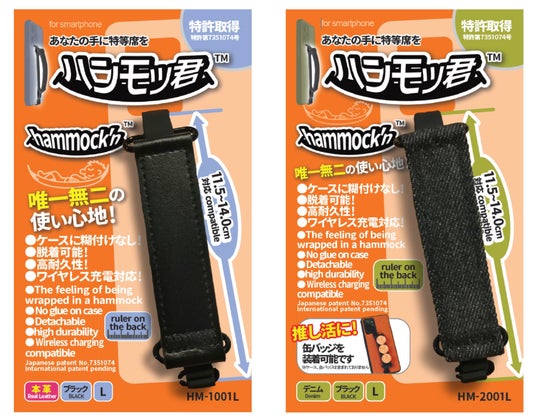2024年11月に発売された「ハンモッ君」は、スマホを長時間使っても指や手首が痛くなりにくい、特許技術を採用したスマホバンドです。バンド形状が自然に手を支え、圧迫感なしにホールドできる構造が特徴。デニム・本革などファッション性にもこだわり、ビジネスにもカジュアルにもマッチします。
