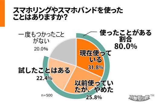 ●スマホリング/バンド経験者8割も、そのうち6割は使用を止めている