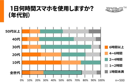 ●1日のスマホ時間、全体の76%が2時間以上! 10%は6時間以上!