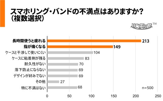このグラフは、スマホリングやスマホバンドに対する不満点を複数選択で尋ねた結果です。「長時間使うと疲れる」(213件)、「指が痛くなる」(149件)が突出して多く、使用による身体的負担が最も大きな不満であることが明らかです。次いで「ケースと干渉して使いにくい」(104件)、「粘着剤が残る」(83件)、「耐久性がない」(70件)など、使い勝手や品質に関する不満も多く挙げられています。一方で、「特に不満はない」と答えた人も一定数(68件)おり、満足して使っている層も存在します。全体としては、快適性と使いやすさを両立した製品へのニーズが高いことがうかがえます。