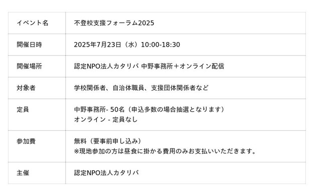 認定特定非営利活動法人カタリバ(本部:東京都中野区、代表理事:今村久美、以下カタリバ)はメタバースを活用した支援や、自治体の政策をサポートする事業など、さまざまな不登校支援に取り組んでいます。この度、学校関係者・行政関係者や民間事業者を対象に、支援現場の最新事例などを交えながら不登校支援の現在地とこれからについて学びあうイベント「不登校支援フォーラム2025」を7月23日(水)にリアル会場とオンライン配信の両方で開催することが決定しましたのでお知らせします。
