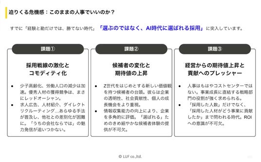 このたび、LUF株式会社は、先日開催しご好評をいただいたセミナー『採用の"ゲームチェンジ":AIがもたらす非連続な進化~「知らない」では済まされない必須知識と、人事の未来像~』 のアーカイブ動画を、本日より当社ウェブサイトにて無料公開いたしましたことをお知らせします。