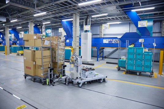 入荷商品の台車を同時に2台搬送できる無人輸送車です。あらかじめ設定されたルートを自動走行し、効率的かつ正確に目的地まで入荷商品を無人で搬送します。