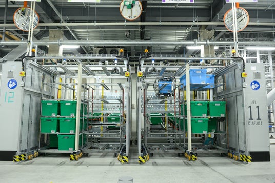 お客さまが注文した商品をピック&パックする最先端のロボットピッキングです。さまざまなサイズ・形状・重量・傷つきやすさを持つ商品を、AIがその場で認識・判断し、袋詰めまでを実施します。グリッド(商品棚)上から商品を直接取り出すことで、従来人手で実施している場所の省スペース化と生産性の向上を実現。1日あたり約20万点の商品ピッキングが可能です。