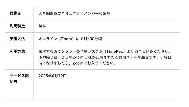 そこで、運営メンバーにカウンセラー資格を持つプロフェッショナルがいるという当コミュニティならではの強みを活かし、「話すことで心が軽くなる」「誰かに聴いてもらえるだけで、次の一歩を踏み出せる」そんな体験を提供したいという想いから、この「人事図書館ほけんしつ」は生まれました。