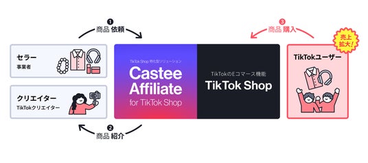 日本での「TikTok Shop」提供開始にあたり、当社がこれまでに培ったTikTokクリエイターとのネットワーク、企業とクリエイターのマッチングノウハウ、コラボによるヒットコンテンツ開発のナレッジをもとに、「TikTok Shop」に特化した新たなソリューションとして「Castee Affiliate for TikTok Shop」を開発いたしました。