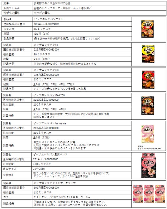 ■ピップエレキバンについてピンポイントでコリを解消する「ピップエレキバン」。磁気が体内成分に働きかけ血行を良くし、コリの原因となる老廃物を流します。貼っている間中効果が続くので、2~5日間貼ることを推奨します。そのままお風呂にも入れます。磁力の強さを選べるため、コリの状態によって使い分けが可能。こっているな、と思うところを指で軽く押さえ「少し痛い、気持ちいい」と感じるところに貼ったり、必要に応じてその周囲にご使用ください。その他、着けるだけで足裏のコリ・はりを手軽にケアする「ピップエレキバン足裏バンド」や、背中まで広がったしつこい肩コリにアプローチする「ピップエレキバンインナークリップ」といった貼らないタイプの商品も展開しています。