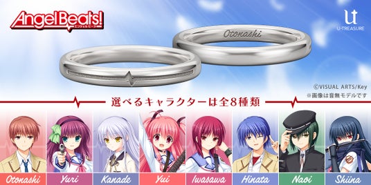 このたびの新作は、「Angel Beats!」のロゴを表面に、内側にキャラクターの名前を刻印したリング(指輪)です。永くご愛用いただけるよう着け心地にまでこだわり仕上げました。