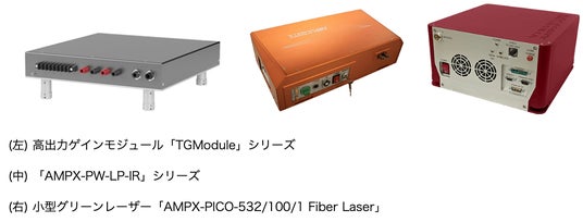 同社の高出力ゲインモジュール「TGModule」シリーズは特許取得済みのテーパー型二重クラッドファイバー(T-DCF)を活用し、最大出力140 W、外部ポンプ対応・シングルモード出力の増幅モジュールで、大面積モードによる非線形効果の低減と高いビーム品質(M²<1.3)を実現します。「AMPX-PW-LP-IR」シリーズは最大出力150 mW、パルス幅20 ps、繰り返し周波数1 MHzに対応し、センシング用途やシードレーザーに最適なレーザーです。最大出力1.5 W(パルスエネルギー 1.5 μJ)、パルス幅50 ps、繰り返し周波数1 MHzに対応した小型グリーンレーザー、「AMPX-PICO-532/100/1 Fiber Laser」、も用意されています。
