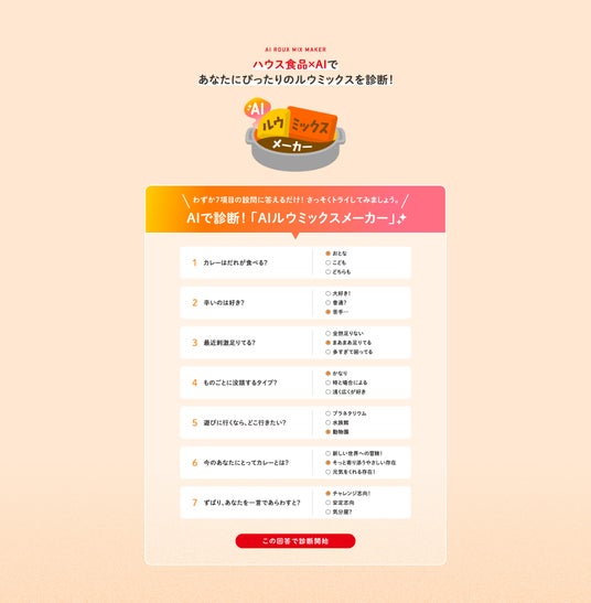 「AIルウミックスメーカー」はAI技術を用い、「カレーはだれが食べる?」「辛いのは好き?」「最近刺激足りてる?」といった、わずか7項目の質問に答えていただくだけで、234通りの組み合わせからお客様にぴったりなカレールウの組み合わせ「ルウミックス」が診断できます。