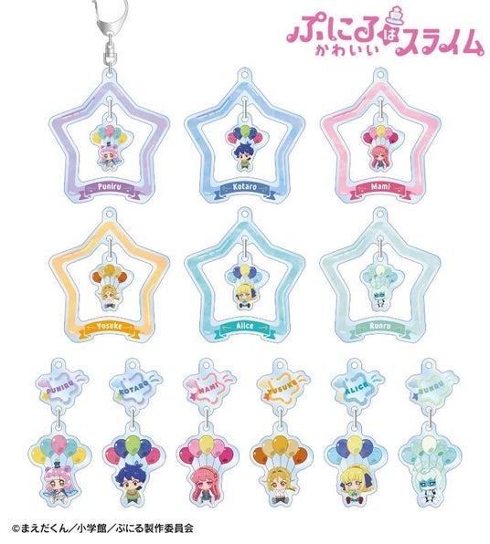 ぷにる、河合井コタロー、雲母麻美、南波遊助、御金賀アリス、ルンルのイラストをお空に風船でぷかぷかと浮いたぬいぐるみをイメージして描き起こし、ゆらゆら動くアクリルキーホルダーに仕上げました。