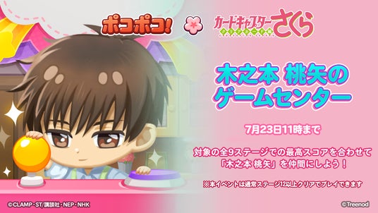 「木之本 桃矢」のゲームセンターを開催します。計9ステージを特定のスコア以上でクリアすると、コラボ仲間の「木之本 桃矢」を仲間にすることができます。