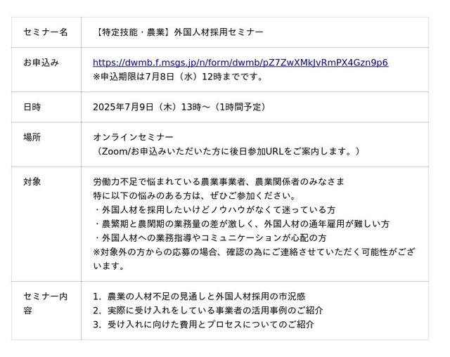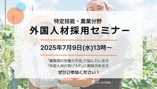 パーソルグループで外国人材に特化した人材サービスを提供するPERSOL Global Workforce(パーソル グローバルワークフォース)株式会社(本社:東京都港区、代表取締役社長:多田 盛弘)は、2025年7月9日(水)に農作業記録アプリ「agmiru」を運営するリデン株式会社と共同で、特定技能・農業分野における「外国人材採用セミナー」を開催します。労働力不足で悩まれている、農業事業者、農業関係者のみなさまのご参加をお待ちしております。