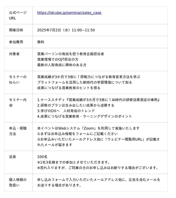 研修のスタイルにとらわれない企業向け人材育成サービスを提供する株式会社LDcube(本社:東京都千代田区、代表取締役社長:新井澄人、以下「当社」)は、「営業成績が3カ月で3倍に!事例からひも解くAI時代の研修の効果測定!」ウェビナーを開催しますので、お知らせします。