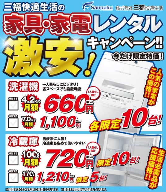 株式会社三福快適生活(所在地:愛媛県松山市、代表取締役:二宮晃輝)は、家具家電レンタルサービス「レン得」にて、台数限定の激安キャンペーンをスタート!