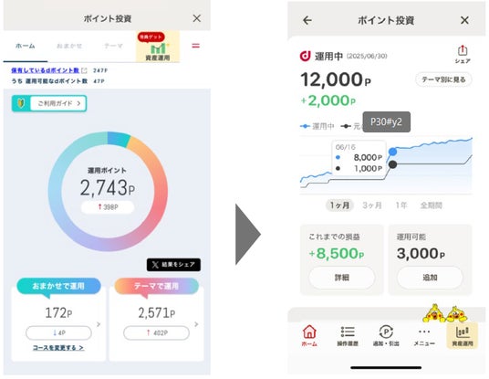 この度、より投資体験をお楽しみいただくため、シンプルでわかりやすく、使いやすいデザインにリニューアルいたします。リニューアルにより、現時点の運用ポイントだけでなく、過去の運用状況と比較した損益の確認が可能になります。また、新たにタブを配置し、「ポイント追加」画面など利用頻度が高いコンテンツをより使いやすくいたします。