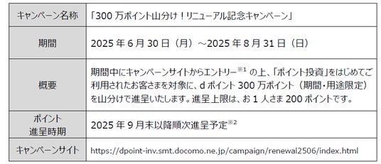 また、リニューアルを記念して、本サービスをはじめてご利用のお客さまを対象に「300万ポイント山分け!リニューアル記念キャンペーン」を2025年6月30日(月)から2025年8月31日(日)まで開催いたします。
