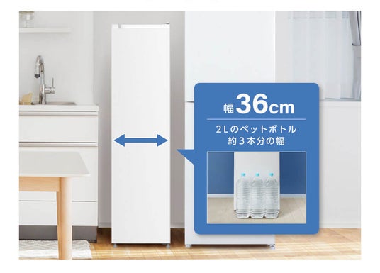 今回発売となる2種の冷凍庫は幅36cmのスリムボディで、キッチンの狭い隙間にピッタリ収納できます。反対に容量は93Lと117Lのビッグサイズ2種類のご用意がございますので、特売日に大量購入した冷凍食品や、ふるさと納税の返礼品等をストックする為の2台目冷凍庫としておすすめできる製品です。