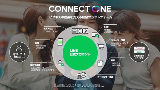 LINEヤフーでは、「LINE公式アカウント」を中心に据えたビジネスプラットフォーム構想「Connect One構想」を推進しています。本構想では、LINEヤフーが保有する多様なサービスやソリューションを連携させ、広告・販促・コマース・顧客体験(CX)・DX・データ分析・CRMなどのビジネス活動を、LINE公式アカウントを起点にワンストップで企業に提供することを目指しています。