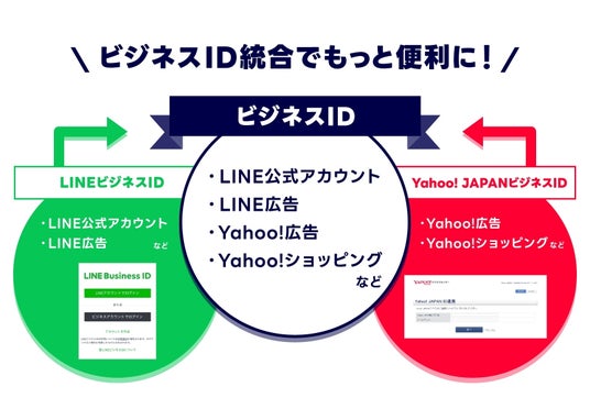 本日より、「LINEビジネスID」は共通のログインIDである「ビジネスID」へと名称が変更になります※1。「Yahoo! JAPANビジネスID」を利用している企業は、2025年7月23日以降、設定画面から「LINEビジネスID」と「Yahoo! JAPANビジネスID」の統合作業を行う※2※3ことが可能となります。これにより、LINEとYahoo! JAPAN の各法人向けサービスごとに分かれていた管理画面のログインIDが統合されるため、企業側の管理工数削減に繋がります。将来的には、「Connect One構想」で実現しようとしている包括的なビジネスプラットフォームへのログインIDとしても利用できるようになります。