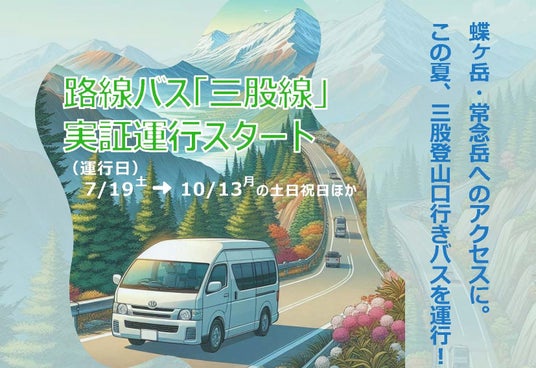 安曇野市地域公共交通協議会(事務局:安曇野市)では、北アルプスパノラマ銀座の蝶ヶ岳・常念岳の登山口となる三股登山口周辺の駐車場の混雑緩和と林道への放置駐車を解消するため、登山口と穂高駅などを接続する新たな路線バス「三股線」の実証運行を下記のとおり行います。