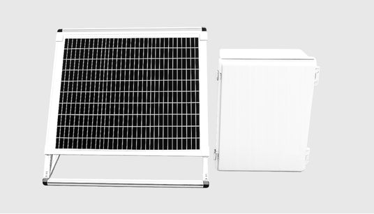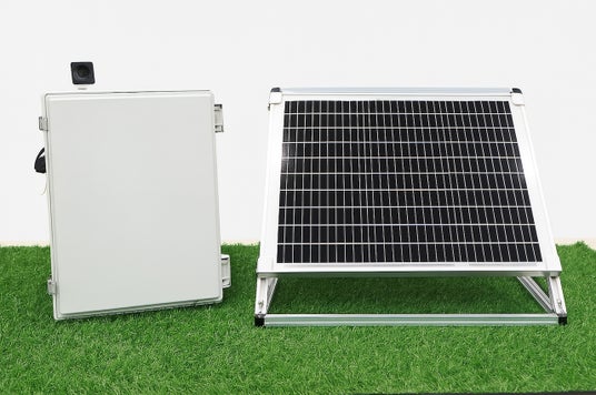 ソーラーパネルと充電バッテリー、通信ルーターと大容量アップロード通信SIMのセットです。屋外や電源・通信環境が整っていない場所でも、ソラカメが利用できます。