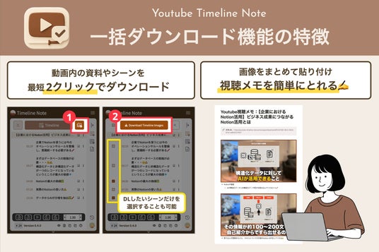 2025年6月17日、株式会社Modelist(本社:東京都、代表取締役:呉縞慶一)は、動画視聴後の情報共有を劇的に効率化する「Youtube Timeline Note」の新機能「画像一括ダウンロード」と「共有機能」をリリースしました。参考資料や動画の要点、気づきなどの情報を、シンプルな操作で共有できるようになることで、ナレッジの属人化や情報伝達の手間を解消し、ビジネス現場の生産性を大幅に向上させます。