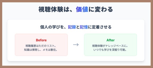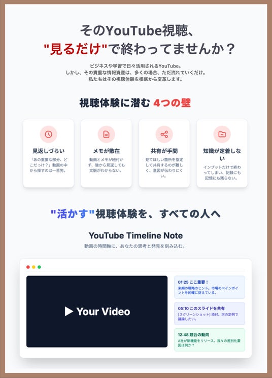 Youtube Timeline Noteを活用いただくことで、個人の学びを更に深く記録にも記憶にも定着化でき、さらに個人の学びを組織の資産に変換できるようになります。これは単なる機能追加ではなく、働き方そのものを変える変革だと確信しています。