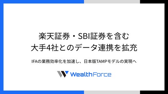 株式会社MONO Investment(本社:東京都品川区、代表取締役:佐々木 辰/中西 諒、以下「当社」)は、ウェルスマネジメント支援プラットフォーム「WealthForce」において、楽天証券・SBI証券・あかつき証券・スマートプラスの4社と新たにデータ連携を拡充しました。