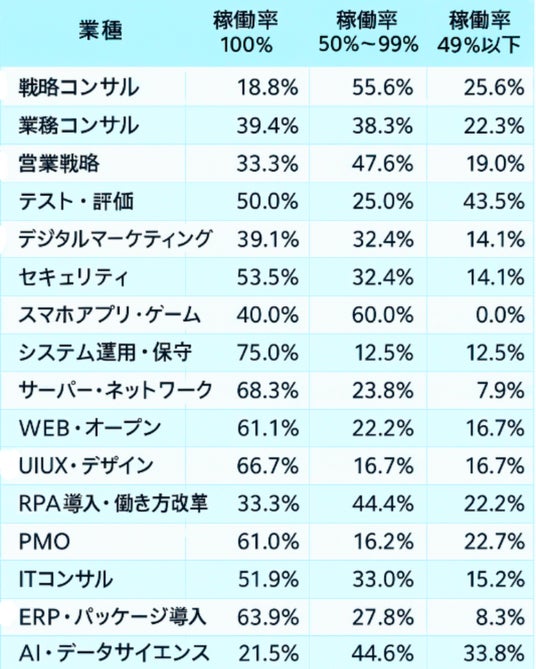 なお、上記の案件単価は、稼働率100%(フルタイム)の案件だけでなく、週2~3日程度の稼働を想定した案件など、様々な稼働率の案件を含んで算出された中間値です。参考として、主要な案件ジャンルにおける稼働率の分布を以下に示します。
