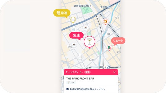 機能としては、チェックインしたスポットと常連度をマップで可視化することが可能になっております。