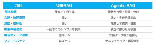単なる「1 回の検索→生成」 ではなく、 必要に応じて複数回の検索や思考を繰り返します。 また、 状況に応じたフロー分岐や外部API、 計算ツールなどの活用も可能です。