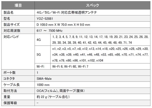 株式会社ヨコオ(本社:東京都千代田区、社長:徳間孝之)は、このたび、世界最高水準となる透過率80%以上の透明アンテナを開発し、6 月末からサンプル出荷を開始します。 本アンテナは、幅広い帯域(4G, 5G, Wi-Fi6, Wi-Fi6E, Wi-Fi7)に対応できるため、様々な用途で利活用されることを期待しています。