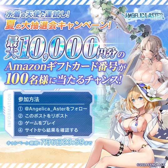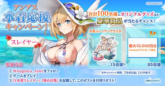 公式X(https://x.com/Angelica_Aster)をフォロー&RPして登場するキャラの「#キャラ名」「褒め言葉」を投稿してキャンペーンに参加すると、該当キャラの水着キャラアクスタなど豪華賞品を100名にプレゼントいたします!