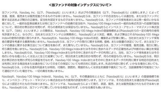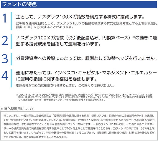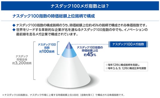 当ファンドはナスダック100メガ指数を構成する株式を主要投資対象とし、ナスダック100メガ指数(税引後配当込み、円換算ベース)の動きに連動する投資成果を目指して運用を行います。(当ファンドは、特化型運用を行います。*)