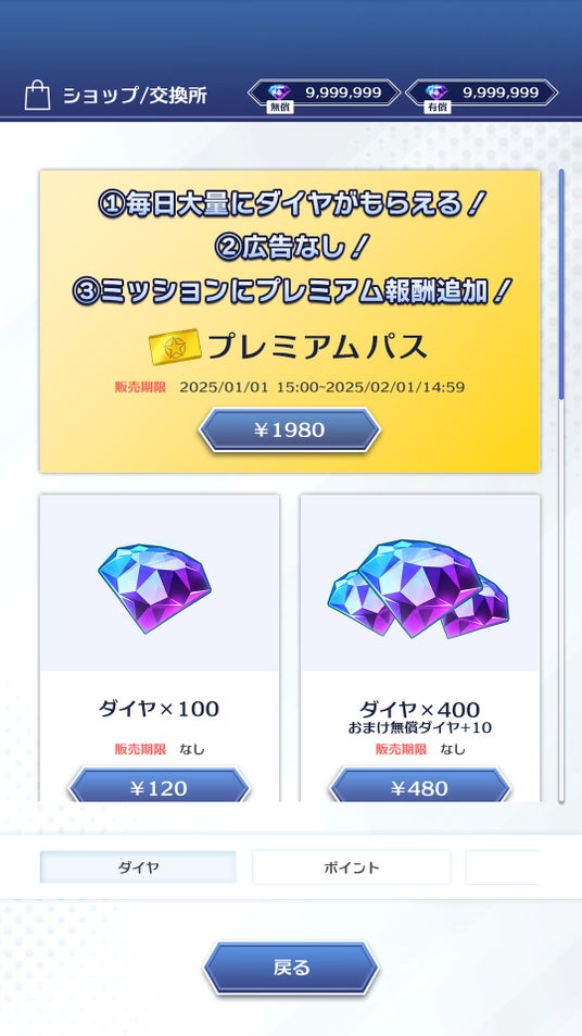 ※広告なし、分析機能、ゲーム内ダイヤ付与などの特典付き