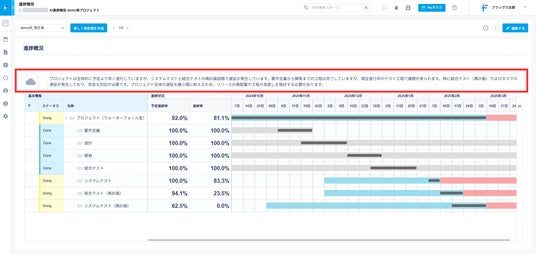 1️⃣「AI進捗報告書作成機能」β版 :リアルタイムで客観的な進捗報告を自動生成Flagxs(フラッグス)に集約されているプロジェクトデータ(プロジェクト進捗状況、人材の業務割り当て、および稼働状況等)をもとに、プロジェクトにおいて必要不可欠な進捗報告書を自動で正確に作成し、さらにAI が定性コメントを生成します。試算によると、プロジェクト進捗報告書作成の時間/手間が今後の機能改善を含めて最大50%削減されると期待されます。