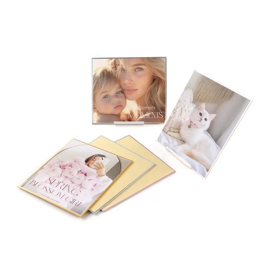 縁(フチ)のカラーはゴールド・シルバー・ピンクの3色から選べ、飾るシーンやデザインに合わせて最適な一枚を作成可能。さらに、フック付きやスタンド機能付きのタイプもラインナップされており、お部屋や展示会でのディスプレイも簡単です。