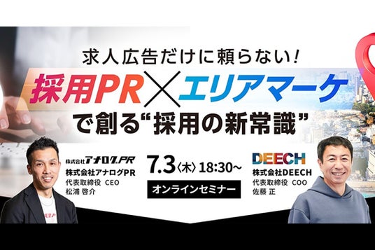 「企業の情報と印象をデザインする」をコンセプトに掲げ、メディアとWEBとオフラインを融合させたマーケティング戦略を提供する、株式会社アナログPR(本社:東京都港区、代表取締役:松浦啓介)は、2025年7月3日(木)に株式会社DEECH(本社:東京都)との共催で、「採用PR × エリアマーケティングで創る『採用の新常識』」と題した無料オンラインセミナーを開催いたします。