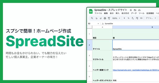 「SpreadSite」は、誰もが一度は使ったことがあるExcelやGoogleスプレッドシートの感覚で、スプレッドシートをそのままホームページの管理システムとして利用する、全く新しい発想のホームページ作成サービスです。ユーザーはスプレッドシートにテキストや画像リンクを入力するだけで、自動的にデザインが最適化されたホームページを構築・更新できます。