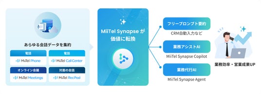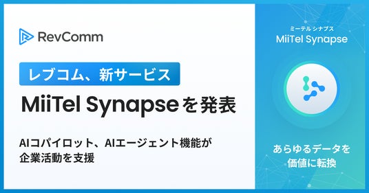 株式会社RevComm(レブコム、本社:東京都渋谷区、代表取締役:会田武史)は、新サービス「MiiTel Synapse(ミーテル シナプス)」をリリースしました。「MiiTel Synapse Copilot(ミーテル・シナプス・コパイロット)」ならびに「MiiTel Synapse Agent(ミーテル・シナプス・エージェント)」をMiiTel製品群(MiiTel Phone/ Call Center/ Meetings/ RecPod)に統合し、アプリケーションとデータレイヤーを横断したワンストップの音声AIプラットフォームとして提供します。これにより、営業・カスタマーサポート・1on1・経営会議などあらゆるビジネスシーンで意思決定の質とスピードを向上させ、成果を最大化することが可能になります。RevCommは、本サービスを世界に先駆けて展開し、音声AI領域の革新を加速してまいります。