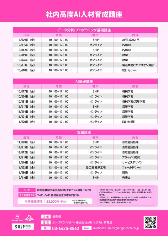 エッジテクノロジー株式会社は静岡県の委託を受け、AIを導入するための実践的なスキルを身に着けられる「社内高度AI人材育成講座」を開催します。