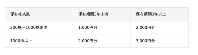 今回の株式分割に伴い、株主優待制度について以下のとおり変更いたします。なお、今回の株主優待制度の変更は、株式分割に伴う修正であるため、優待内容の実質的な変更はありません。毎年3月末日現在の株主名簿に記載または記録された200株以上を所有する株主を対象に、以下の区分によりQUOカードを年1回進呈します。