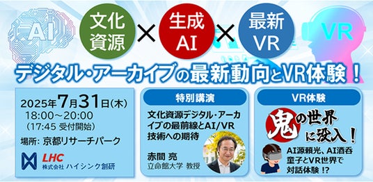 京都リサーチパーク株式会社(代表取締役社長 浅野貢男、以下、KRP)が主催する「KRPフェス2025」にて、2025年7月31日(木)に、株式会社ハイシンク創研による「【文化資源×生成AI×最新VR】デジタル・アーカイブの最新動向とVR体験!」が開催されます。