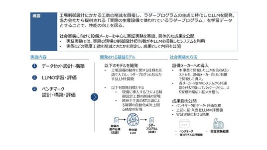 Airionは、本プロジェクトにおいて、ラダープログラムに特化したLLMを開発することで、設備メーカーや工場における自動制御設計の工数を削減し、人手不足の緩和と生産性向上を目指します。設備メーカーから実際の機器で使用されているラダープログラムの提供を受け、これらのデータを活用してラダープログラム特化のLLMを学習させます。また、現場への導入を行い、業務工数の削減効果を検証します。