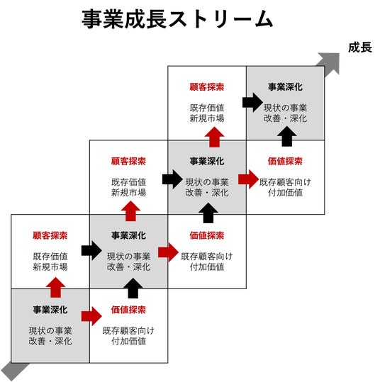 新規のニーズを掘り下げる「価値探索」と、新規の市場を開拓する「顧客探索」の2つを繰り返し、事業深化を続けていきます。