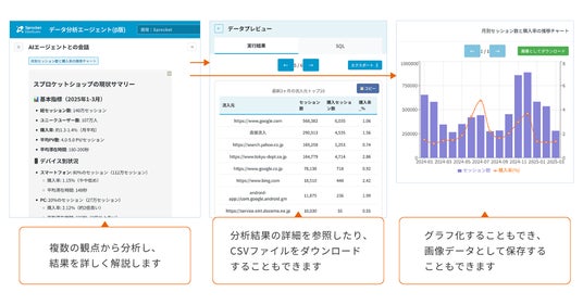 専門的な知識は不要で、「先月の売上トップ10商品を教えて」「PCとスマホのコンバージョン率を比較して」といった日常的な言葉で分析を依頼できます。AIが意図を理解し、適切なデータ抽出と分析を自動で実行します。