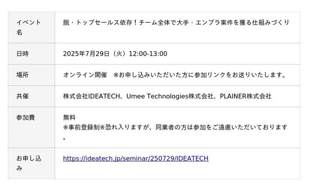 ■今後のセミナー情報|7月29日(火)12:00-13:00「脱・トップセールス依存!チーム全体で大手・エンプラ案件を獲る仕組みづくり」に登壇!